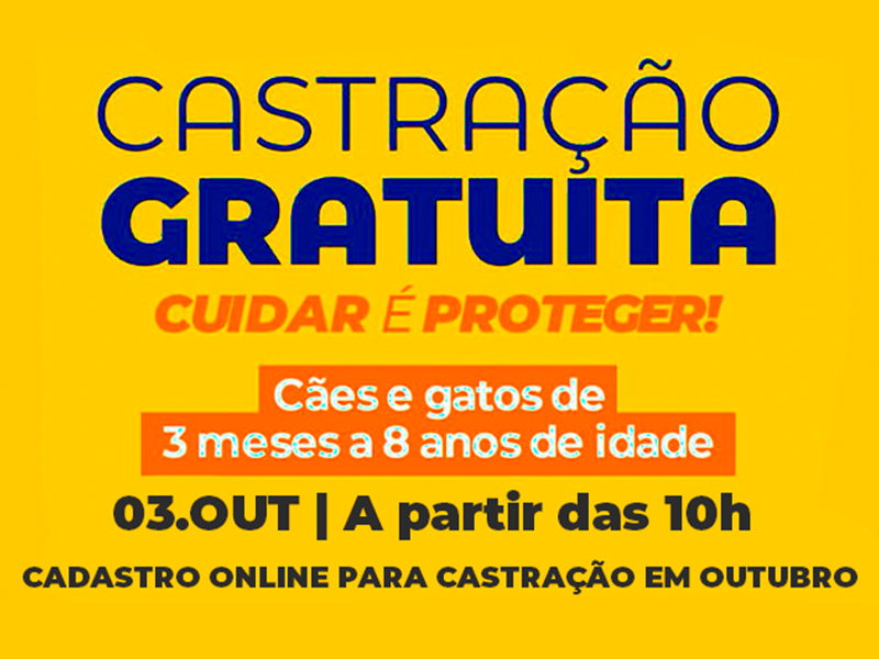 A Prefeitura de Angra dos Reis, por meio da Superintendência de Bem-Estar Animal, abre a partir de amanhã, 3 de outubro, as vagas para castração gratuita de cães e gatos no neste mês. Podem ser castrados animais saudáveis de 3 meses a 8 anos de idade e que tenham tutores. As vagas são limitadas, e as inscrições serão feitas on-line, a partir das 10h, pelo link: https://angra.rj.gov.br/castracaoanimal.