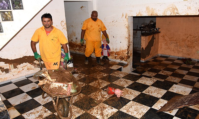 Equipes auxiliaram moradores na remoção de entulhos e lama em que invadiram as casas por conta da ch...